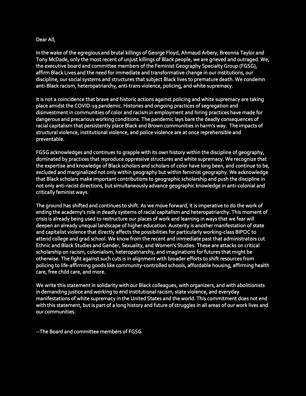 In the wake of the egregious and brutal killings of George Floyd, Ahmaud Arbery, Breonna Taylor and Tony McDade, only the most recent of unjust killings of Black people, we are grieved and outraged. We, the executive board and committee members of the Feminist Geography Specialty Group (FGSG), affirm Black Lives and the need for immediate and transformative change in our institutions, our discipline, our social systems and structures that subject Black lives to premature death. We condemn anti-Black racism, heteropatriarchy, anti-trans violence, policing, and white supremacy…